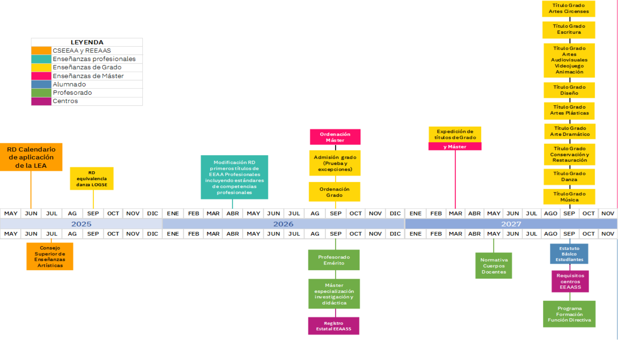 "En el plazo de dos años desde la entrada en vigor de la LOMLOE, el Gobierno, previa consulta a las comunidades autónomas, al Consejo Superior de Enseñanzas Artísticas y oído el Consejo de Universidades, presentará una propuesta normativa para la regulación de las condiciones básicas para la organización de las enseñanzas artísticas superiores previstas en el artículo 58, además de las que se refieren a las titulaciones y requisitos del profesorado derivados de las condiciones de inserción de estas enseñanzas en el marco de la educación superior." La Ley de Enseñanzas Artísticas ha sido aprobada el 23 de mayo de 2024 y publicada en el Boletín Oficial del Estado el 8 de junio de 2024.